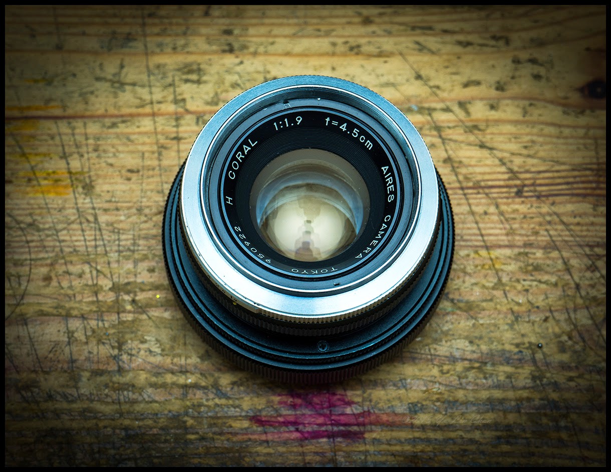 The Aires Coral 4.5cm f1.9 lens has a proprietory lens mount, and the focus, presumably is on the camera body since the lens does not have it. The aperture does not completely open at maximum. Perhaps that may have caused the strange looking, but still interesting bokeh. The lens is quite sharp, especially when stopped down. It has decentering problem, no doubt caused by my home made adapter. In all, an uncommon lens that produces interesting results. Thanks John!